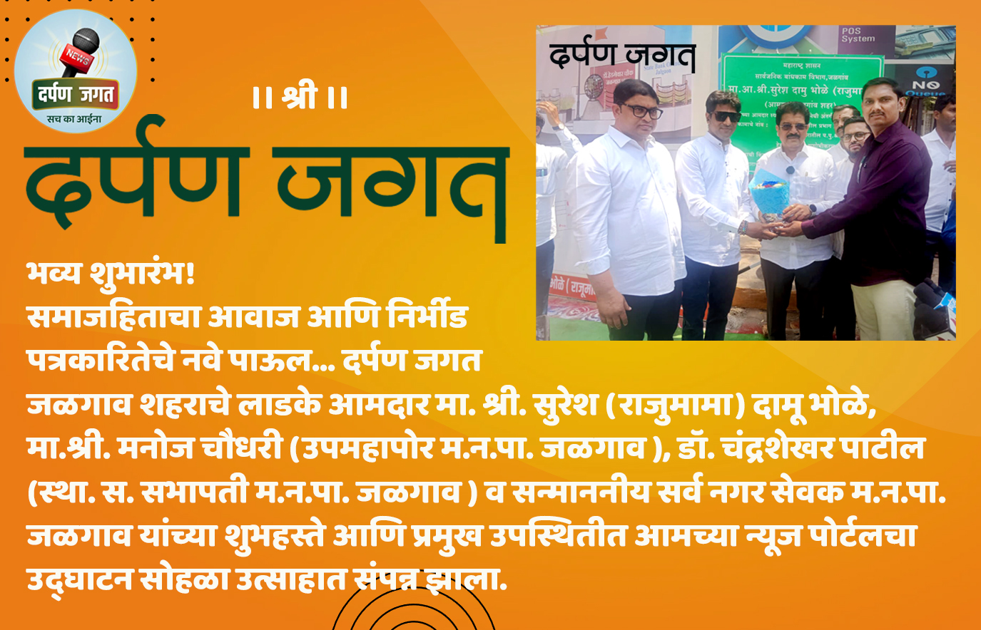 ।। श्री ।। भव्य शुभारंभ! समाजहिताचा आवाज आणि निर्भीड पत्रकारितेचे नवे पाऊल… दर्पण जगत जळगाव शहराचे लाडके आमदार मा. श्री.…
